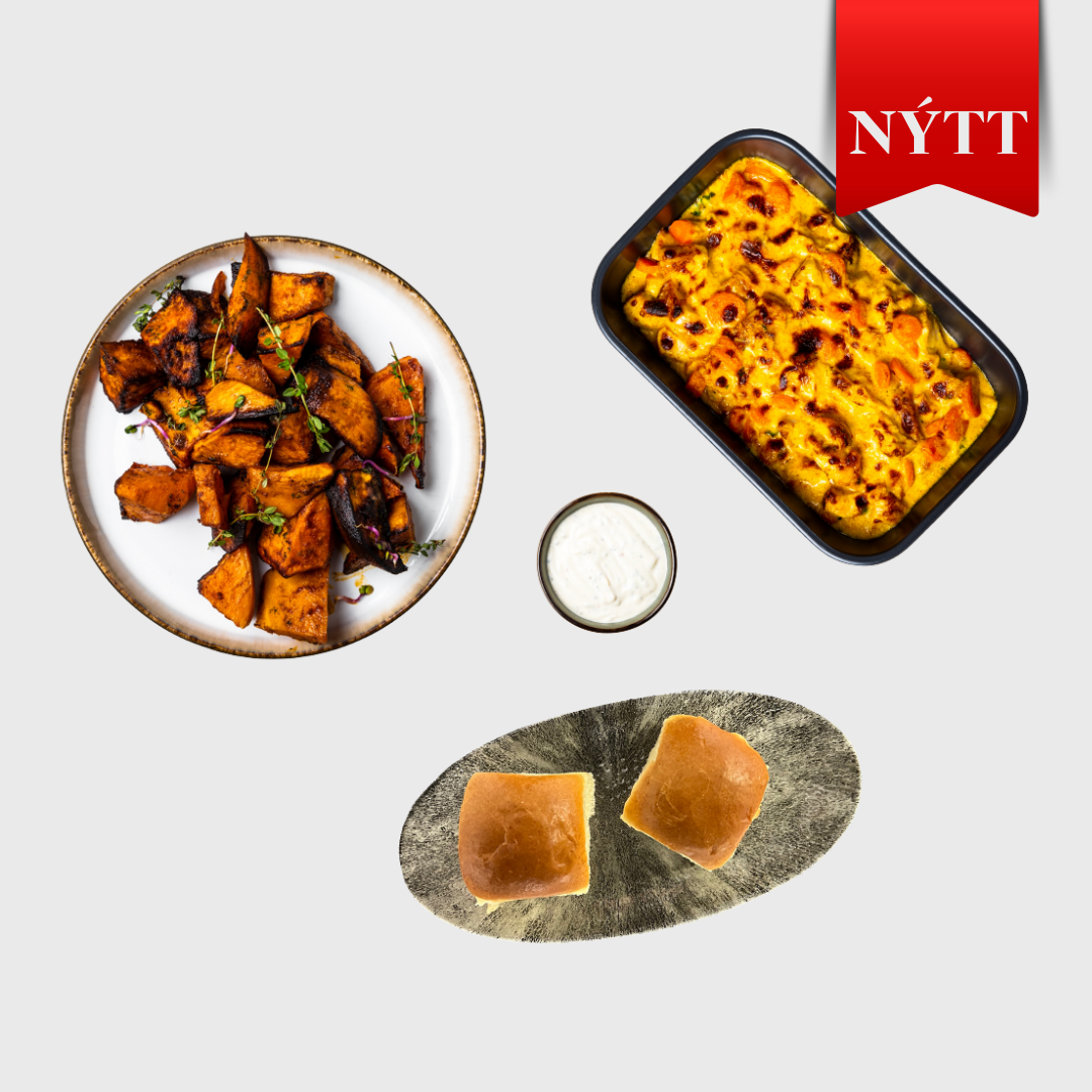 Ómæ! Hvar ætlar þetta að enda! Við höfum toppað okkur aftur! Hversu skemmtilegt er að fá að hlakka til að borða lamb í karrý í kvöldmatinn? Með þessu ætlum við að hafa sætkartöfluteninga, þessa mjúku og sætu brauðbollu sem við elskum og svo hvítlauksjógúrtsósu. Nú mega allir vera spenntir!