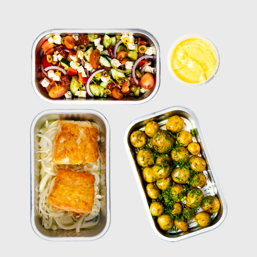 Steiktur fiskur í lauksmjöri, smælki kartöflur, grískt salat og heimagert remolaði!